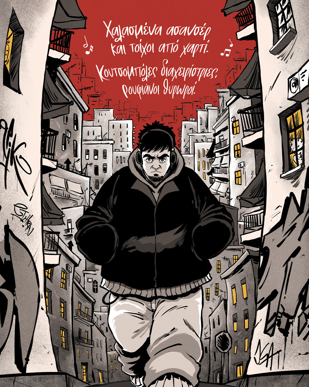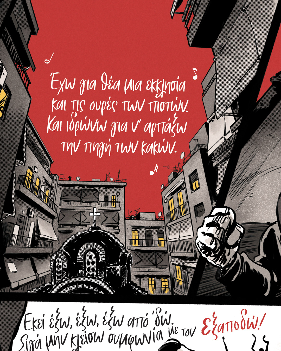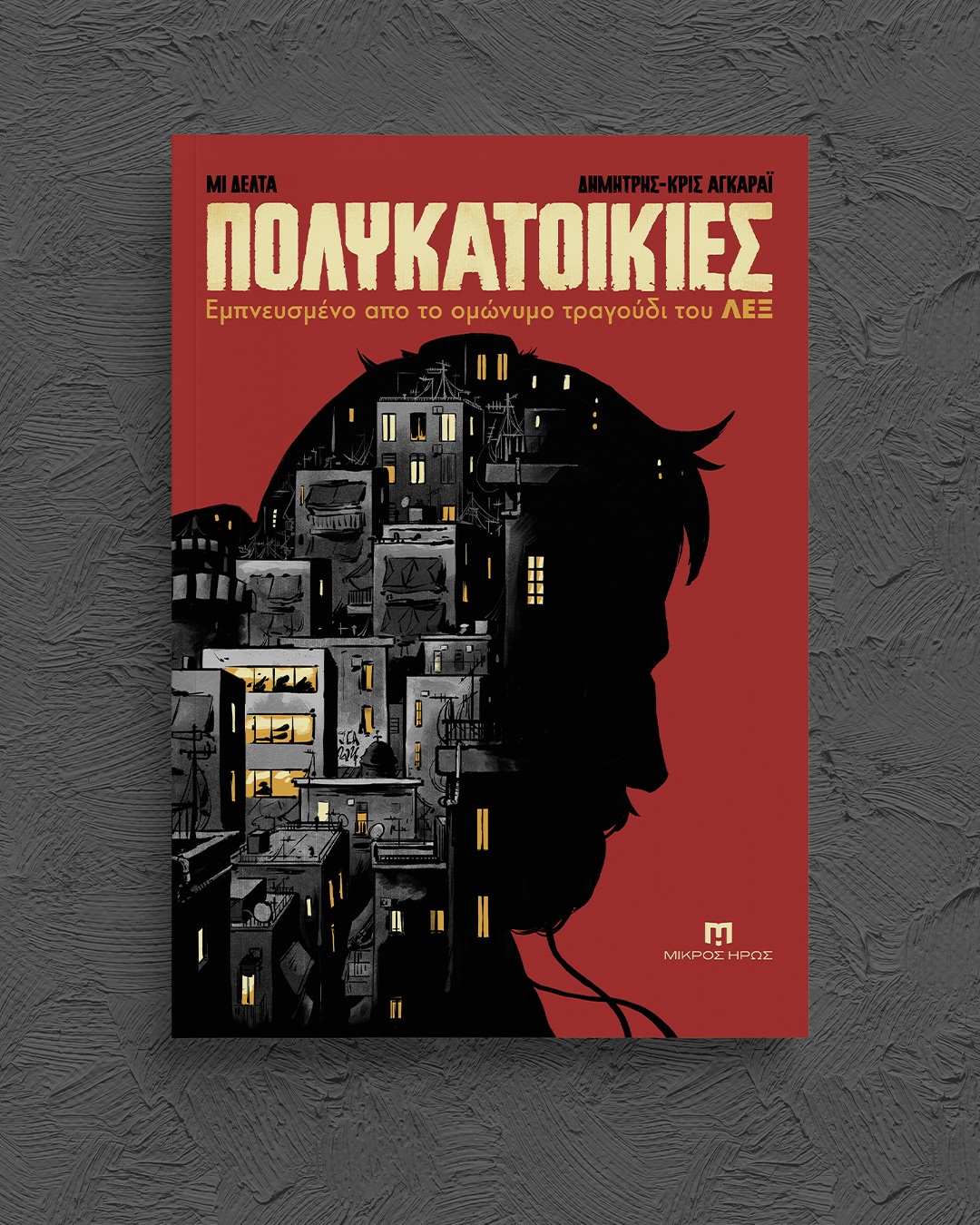 Το Πολυκατοικίες είναι ένα graphicnovel εμπνευσμένο από το ομώνυμο τραγούδι του ΛΕΞ — μια αφηγηματική κατάδυση στα χρόνια της οικονομικής κρίσης.Με ρυθμό που θυμίζει βιντεοκλίπ και εικόνες που κινούνται ανάμεσα στο ρεαλιστικό και το αφαιρετικό, ο Δήμος ξετυλίγει τη ζωή που έζησε όσο ήταν μακριά από τον πατέρα του.Το κομμάτι μιας ολόκληρης γενιάς τώρα γίνεται κόμικς από τους Δημήτρη-Κρις Αγκαράι (Σκυλονουάρ, Μιχαήλ Μιχαήλ του Μιχαήλ) και Μι Δέλτα (Νεκρός Χορός, Τερματοφύλακας Γιατρός – Η Ιστορία Συνεχίζεται…).