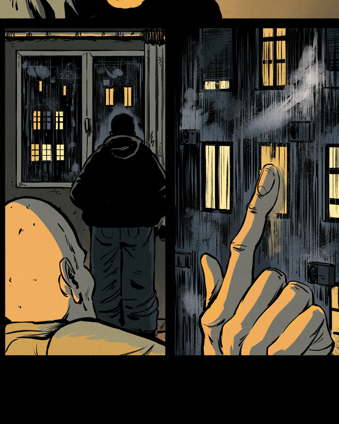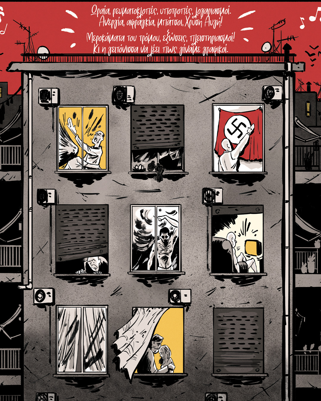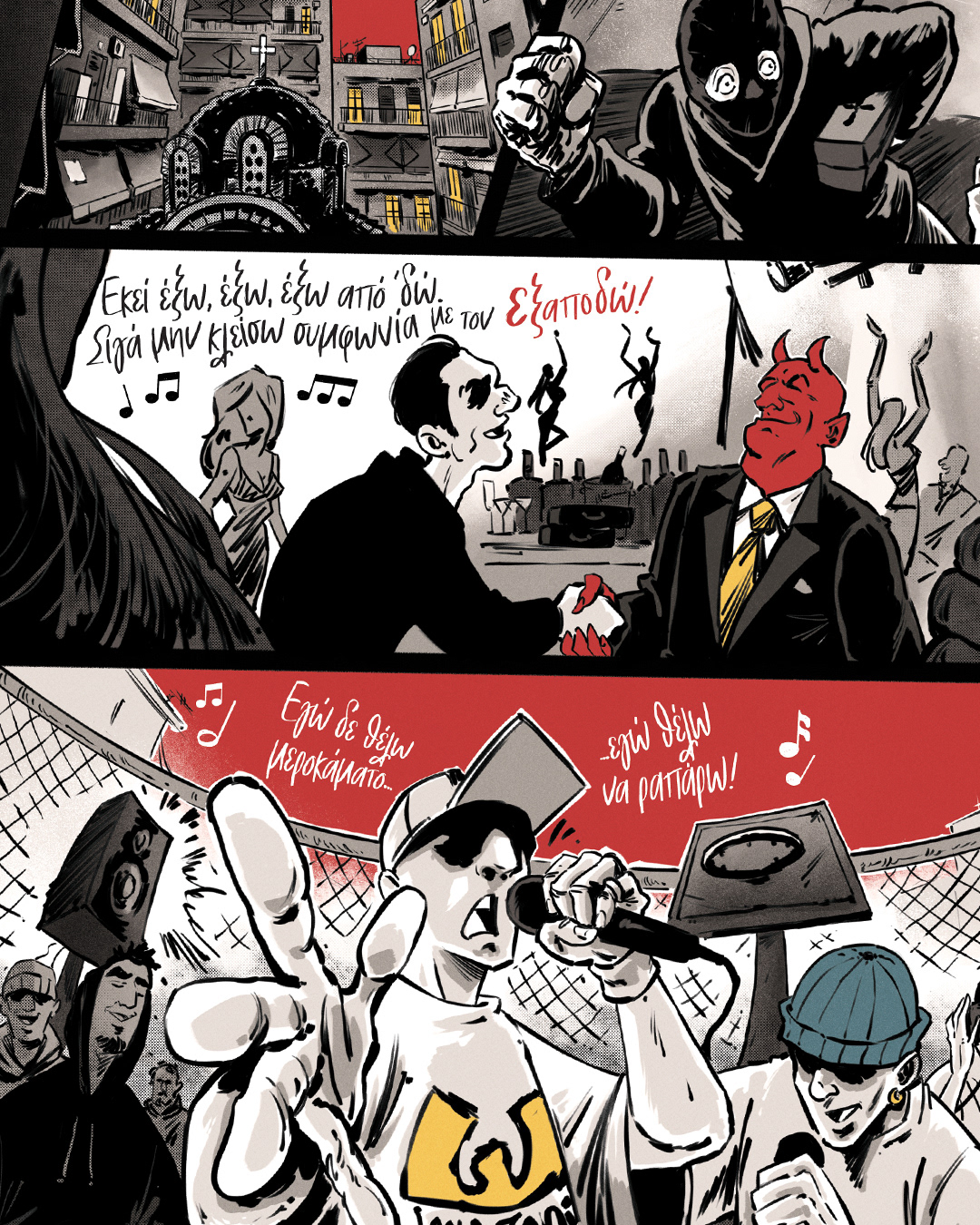 Το Πολυκατοικίες είναι ένα graphicnovel εμπνευσμένο από το ομώνυμο τραγούδι του ΛΕΞ — μια αφηγηματική κατάδυση στα χρόνια της οικονομικής κρίσης.Με ρυθμό που θυμίζει βιντεοκλίπ και εικόνες που κινούνται ανάμεσα στο ρεαλιστικό και το αφαιρετικό, ο Δήμος ξετυλίγει τη ζωή που έζησε όσο ήταν μακριά από τον πατέρα του.Το κομμάτι μιας ολόκληρης γενιάς τώρα γίνεται κόμικς από τους Δημήτρη-Κρις Αγκαράι (Σκυλονουάρ, Μιχαήλ Μιχαήλ του Μιχαήλ) και Μι Δέλτα (Νεκρός Χορός, Τερματοφύλακας Γιατρός – Η Ιστορία Συνεχίζεται…).